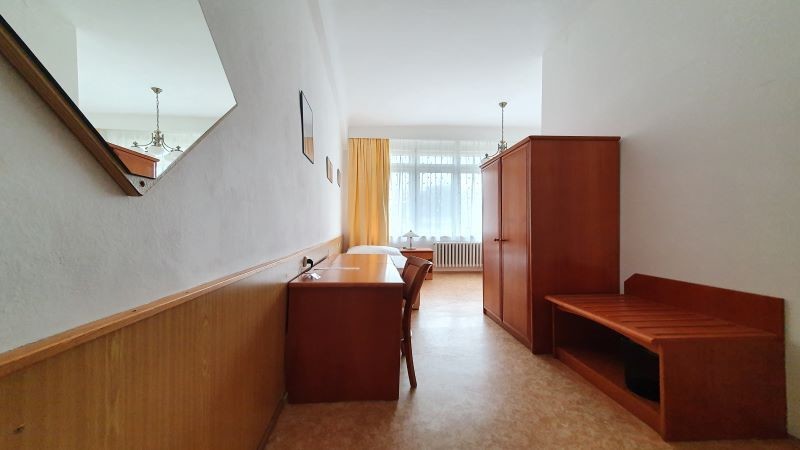 K vybavení tohoto pokoje patří psací stůl a šatní skříň. Na chodbách, na každém patře, jsou v dostatečném množství společné koupelny a toalety.